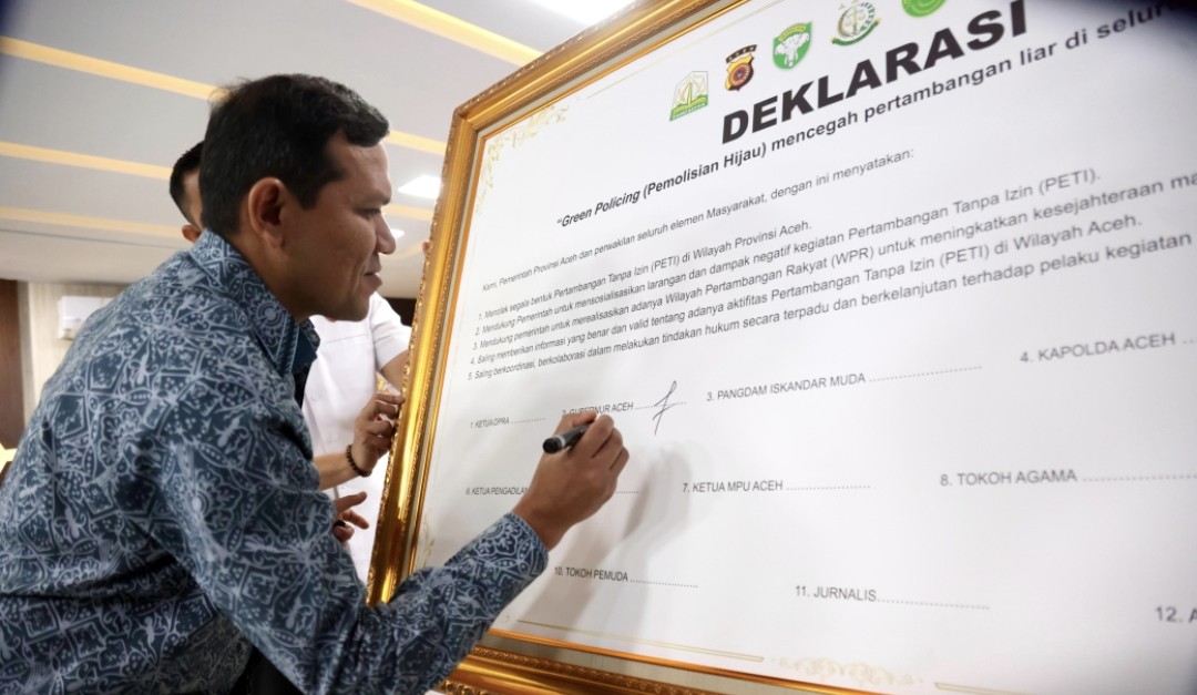 Ia menyebut langkah Kapolda Aceh menggagas Green Policing adalah momentum penting, karena pendekatan ini tidak hanya berbasis penegakan hukum, tetapi juga gerakan moral, edukasi, dan kolaborasi lintas elemen. “Pemerintah Aceh mendukung penuh. Kita tidak menutup mata terhadap kebutuhan ekonomi masyarakat, namun segala aktivitas pertambangan harus legal, berizin, dan berkelanjutan. Deklarasi ini harus kita kawal dengan kerja nyata, koordinasi erat, dan komitmen konsisten,” ujar Fadhlullah.